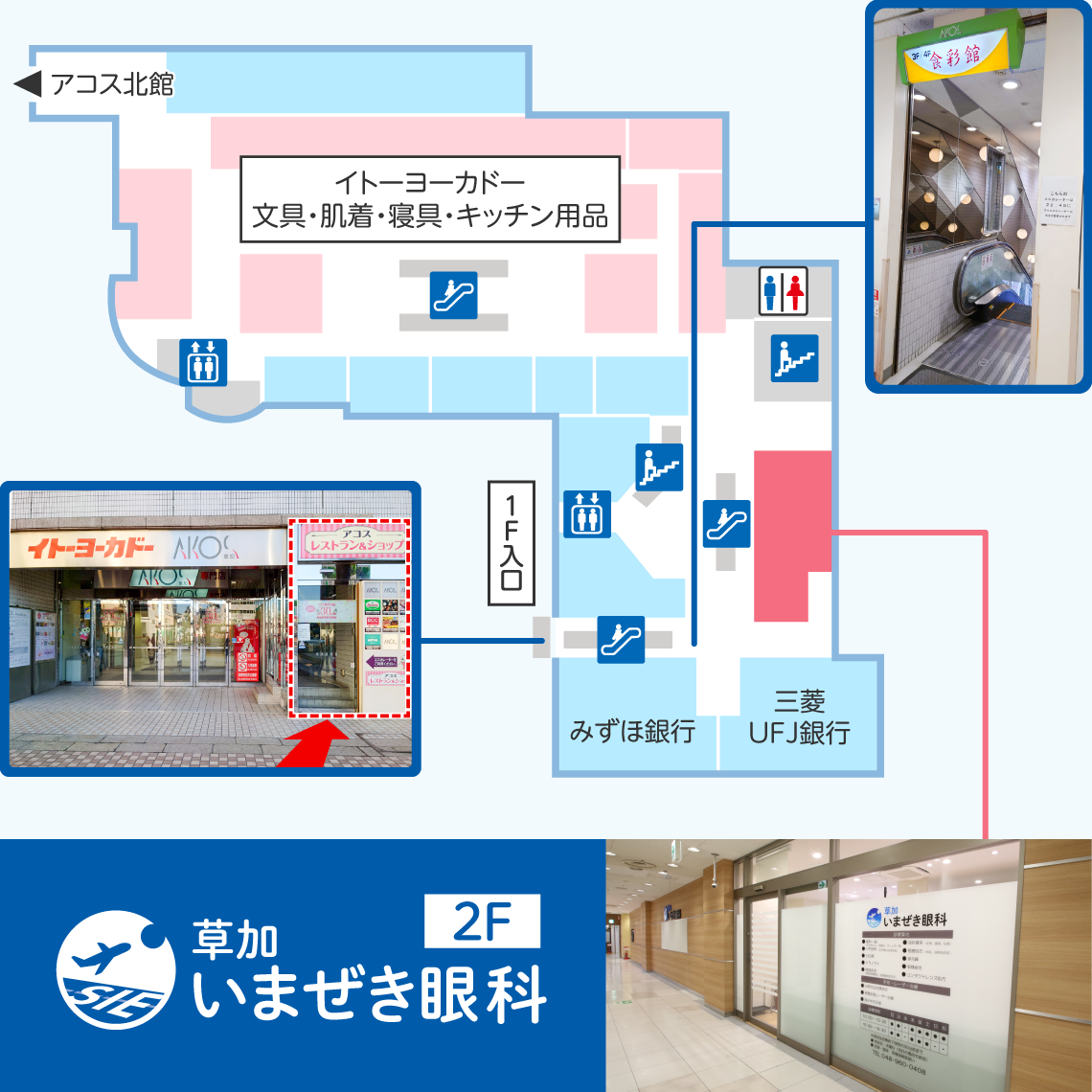 アコス南館の1F入口横から、2Fの眼科横まで直接上がっていただけますので便利です。